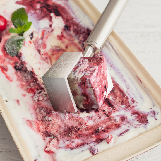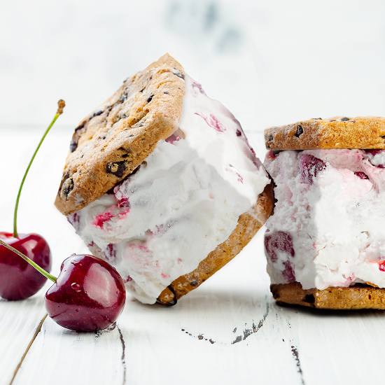チェリーアイスサンドは北海道産のチェリーのアイスをサクサクのクッキーでサンドしたスイーツです。立方体なので大量に持ち運ぶときも便利です。いまだけ、頑丈な箱つきです。